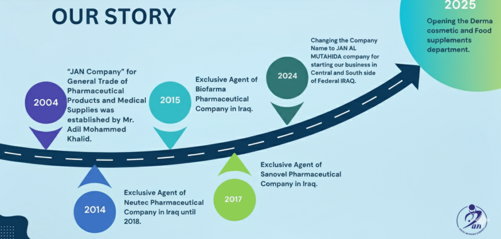 Our journey began in 2004 when Mr. Adil Mohammed Khalid established “JAN Company” for General Trade of Pharmaceutical Products and Medical Supplies. Over the years, we’ve achieved significant milestones: